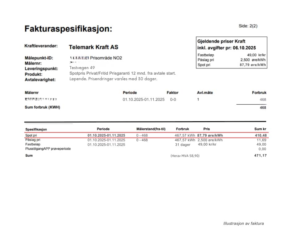 Du får én faktura fra oss i Telemark Kraft for strømforbruket ditt, som du må betale, og én faktura fra nettselskapet ditt hvor prisen for Norgespris er justert.